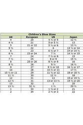 | EU shoe size | 16 | 17 | 18 | 19–22 | 23–26 | 27–31 | 32–35 | 36–38 | 39–40 |